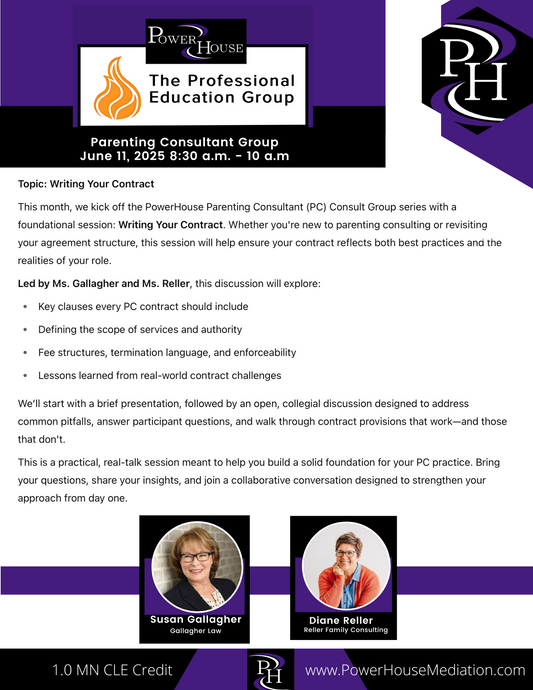 Parenting Consultant and Parenting Time Expeditor Trainings, Consultant Groups and CLE's